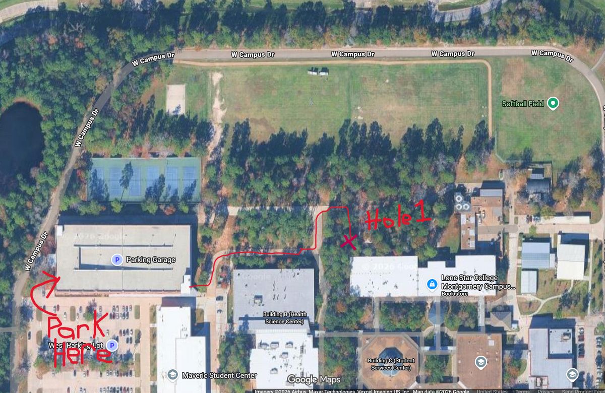 You can get directions to Lone Star College Disc Golf Course by clicking Get Directions, which will open your device's map application with the disc golf course location. The disc golf course is located at 30.212240868587017, -95.46774051936787 in The Woodlands, Texas.